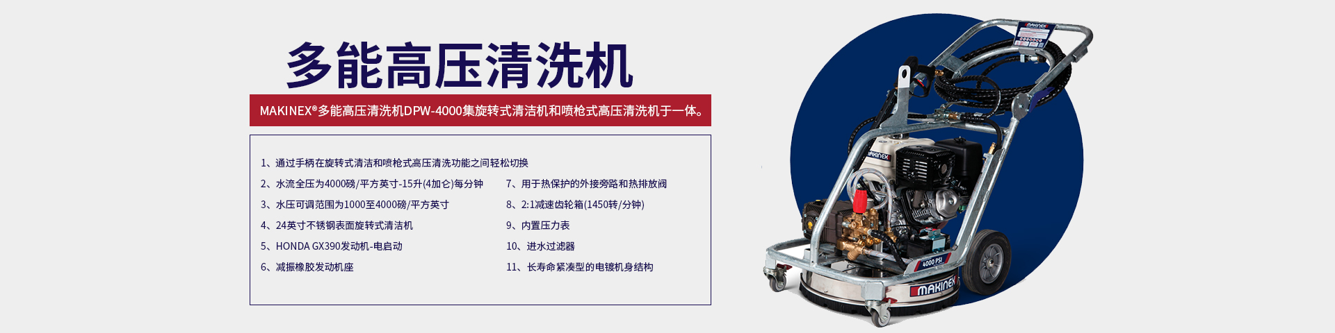 Makinex多能高壓清洗機DPW-4000具有無可比擬的多用性。雙清洗機功能和可調(diào)節(jié)的水壓使其完美適用于重型外部清潔應用…